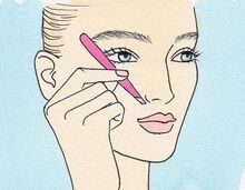 Odwrócić pęsetę do góry nogami tak, aby jej szczypczyki skierowane były w dół. Przytrzymać ją pionowo wzdłuż płatka nosa. Początek brwi powinien znajdować się w punkcie, w którym wierzchołek pęsety ją przecina (ok. 2,5 cm od wewnętrznego kącika oka). Aby zaznaczyć punkt początkowy, narysować pionową linię kredką do oczu. Usunąć włoski znajdujące się pomiędzy nasadą a wyznaczoną linią.