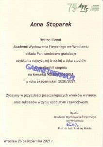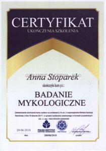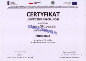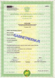 - Ukończona z wyróżnieniem I i II stopnia Państwowa Wyższa Uczelnia AWF we Wrocławiu na wydziale Fizjoterapii, kierunek Kosmetologia/Podologia