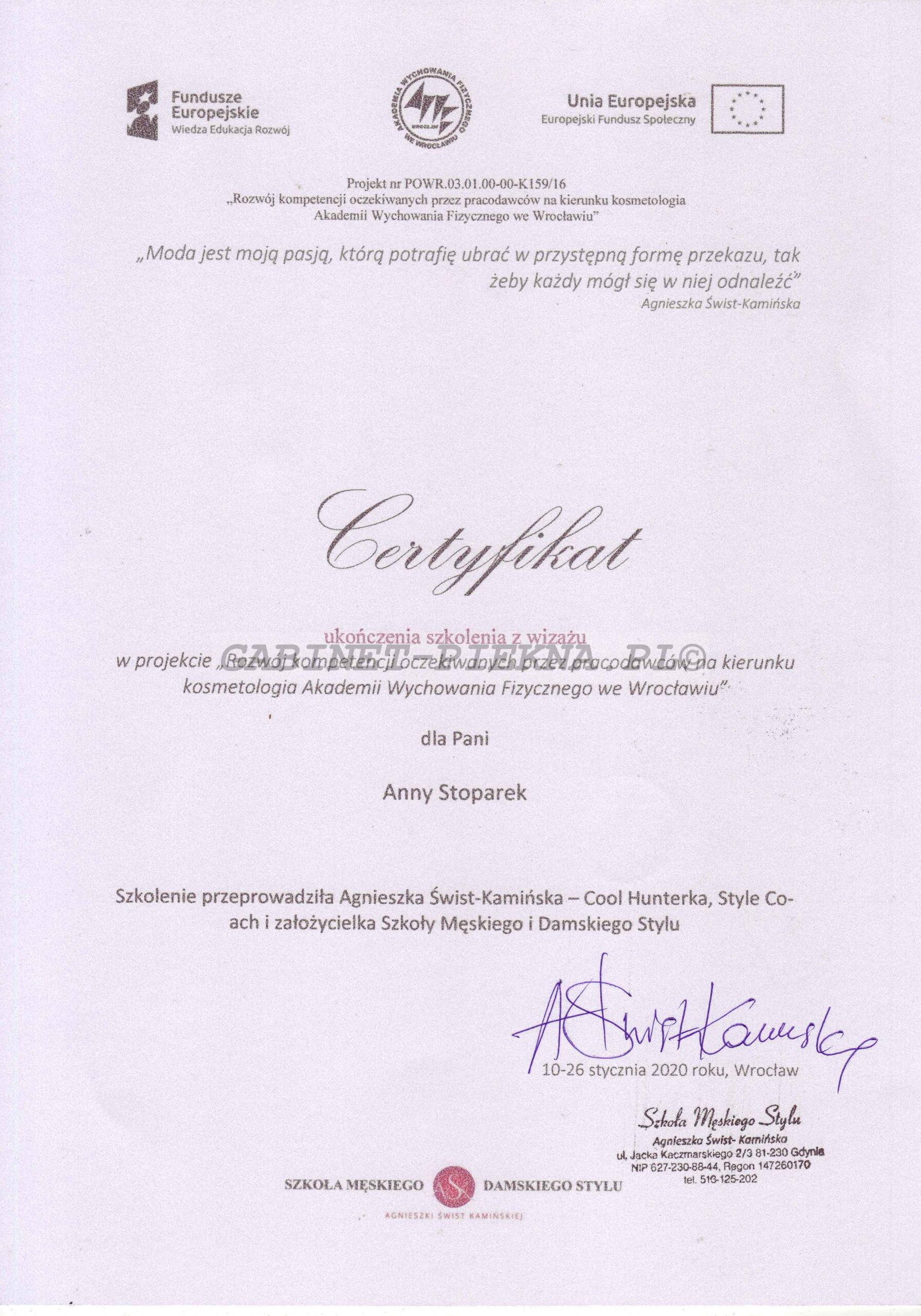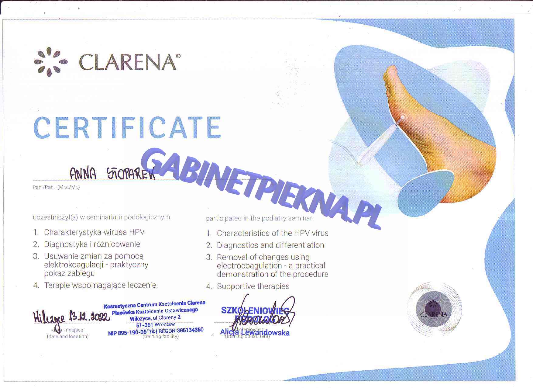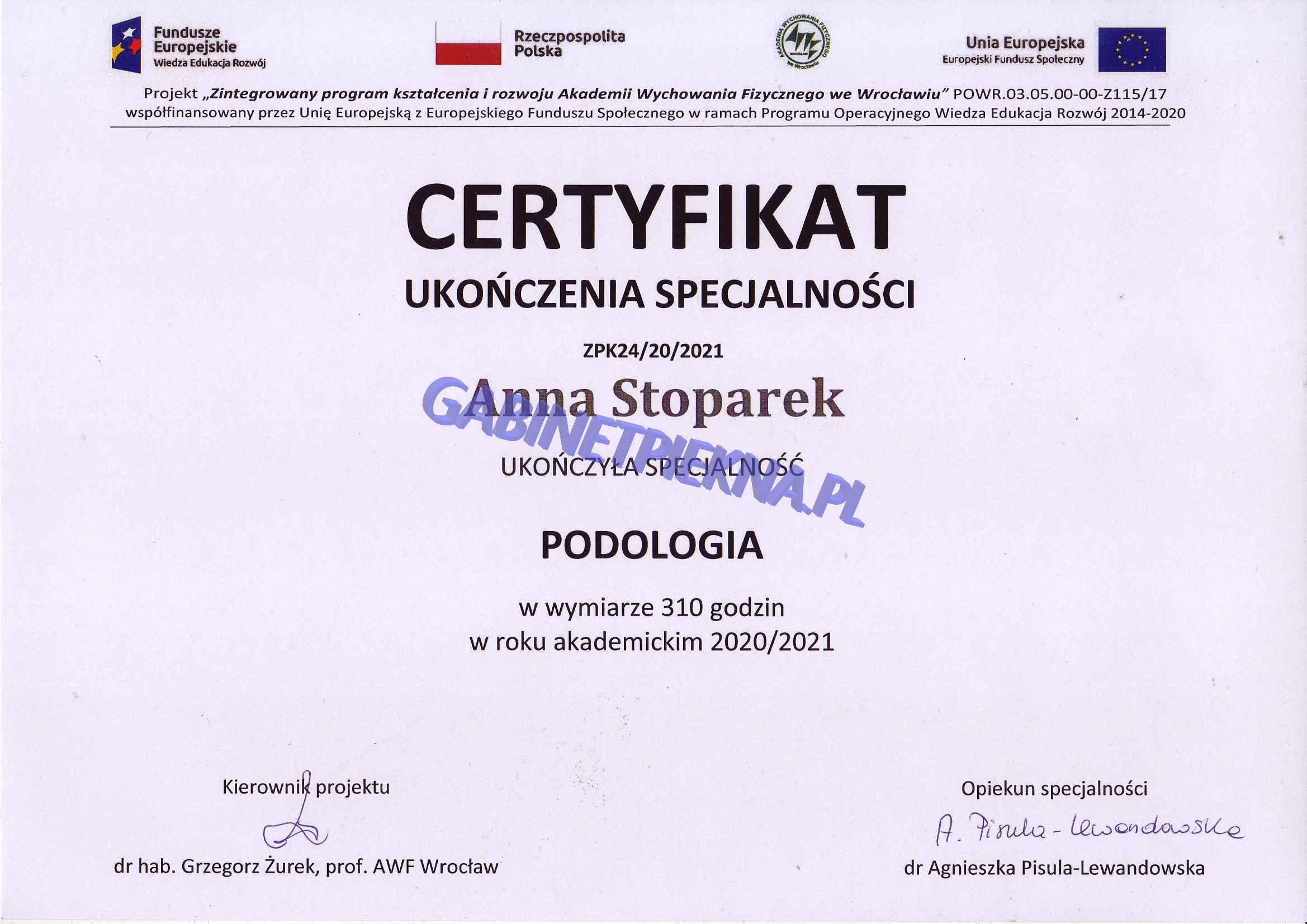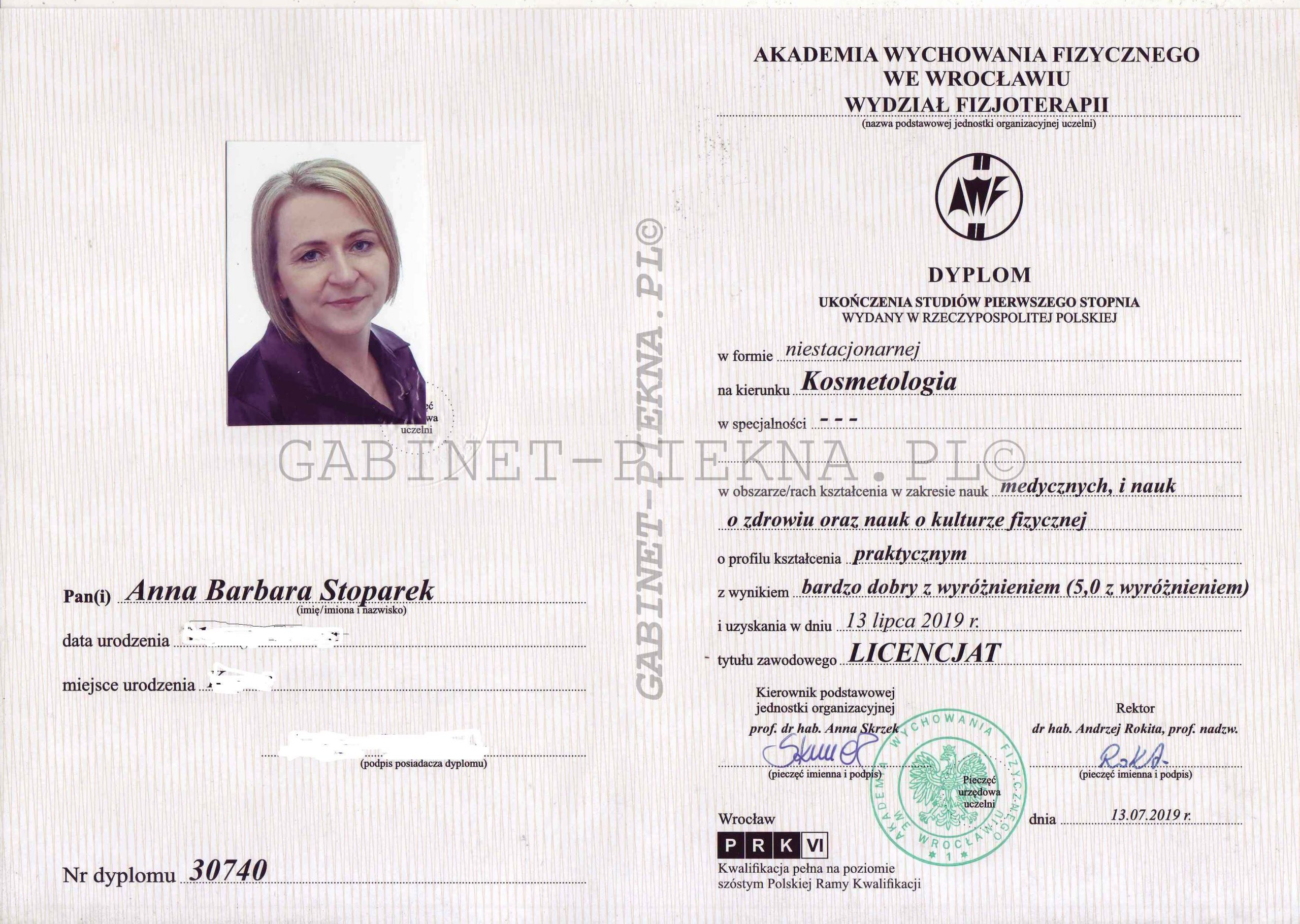- Ukończona z wyróżnieniem I i II stopnia Państwowa Wyższa Uczelnia AWF we Wrocławiu na wydziale Fizjoterapii, kierunek Kosmetologia/Podologia