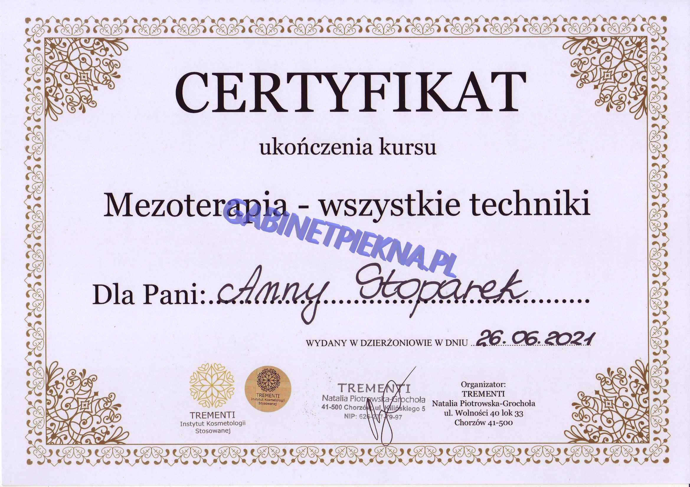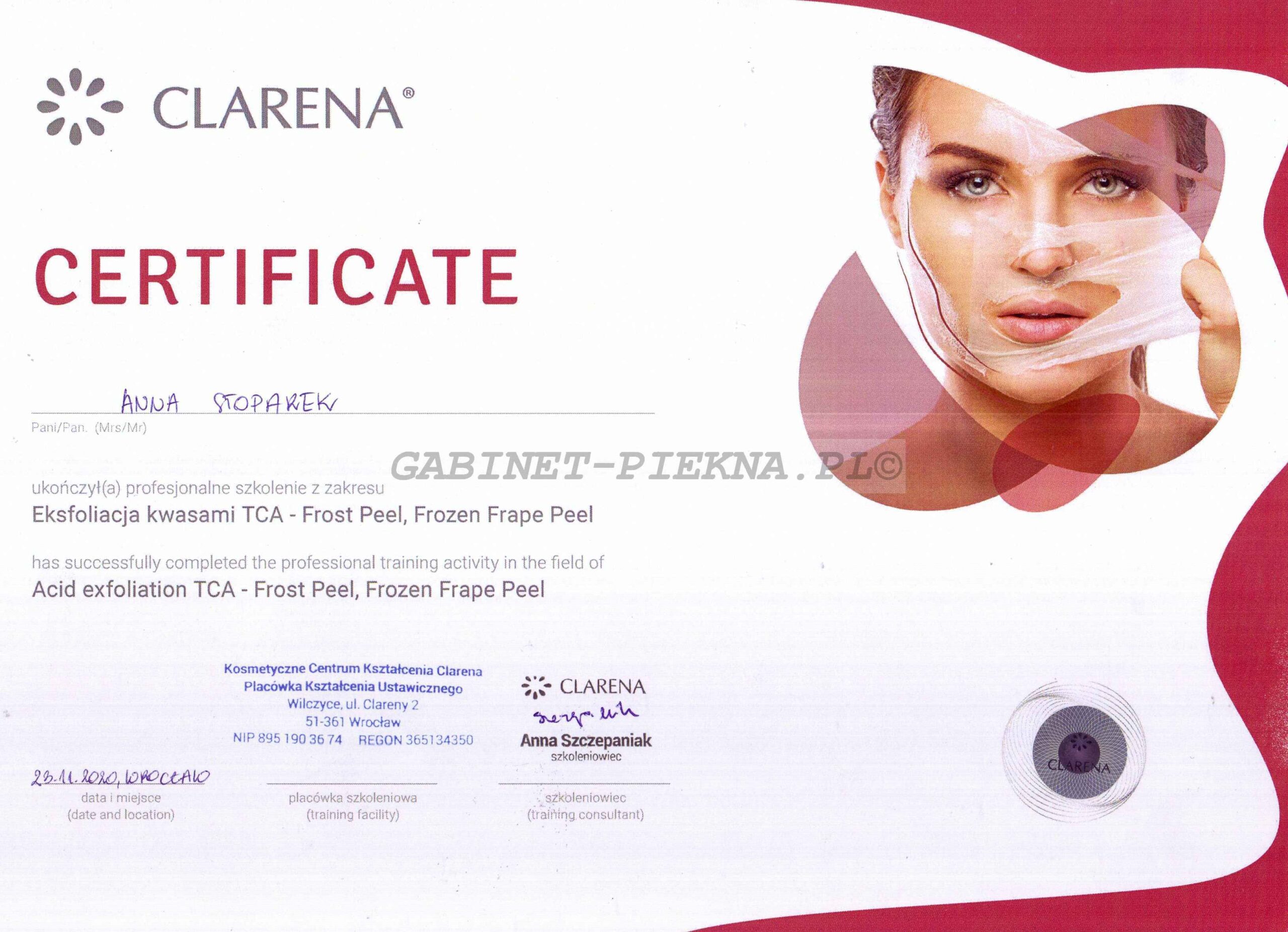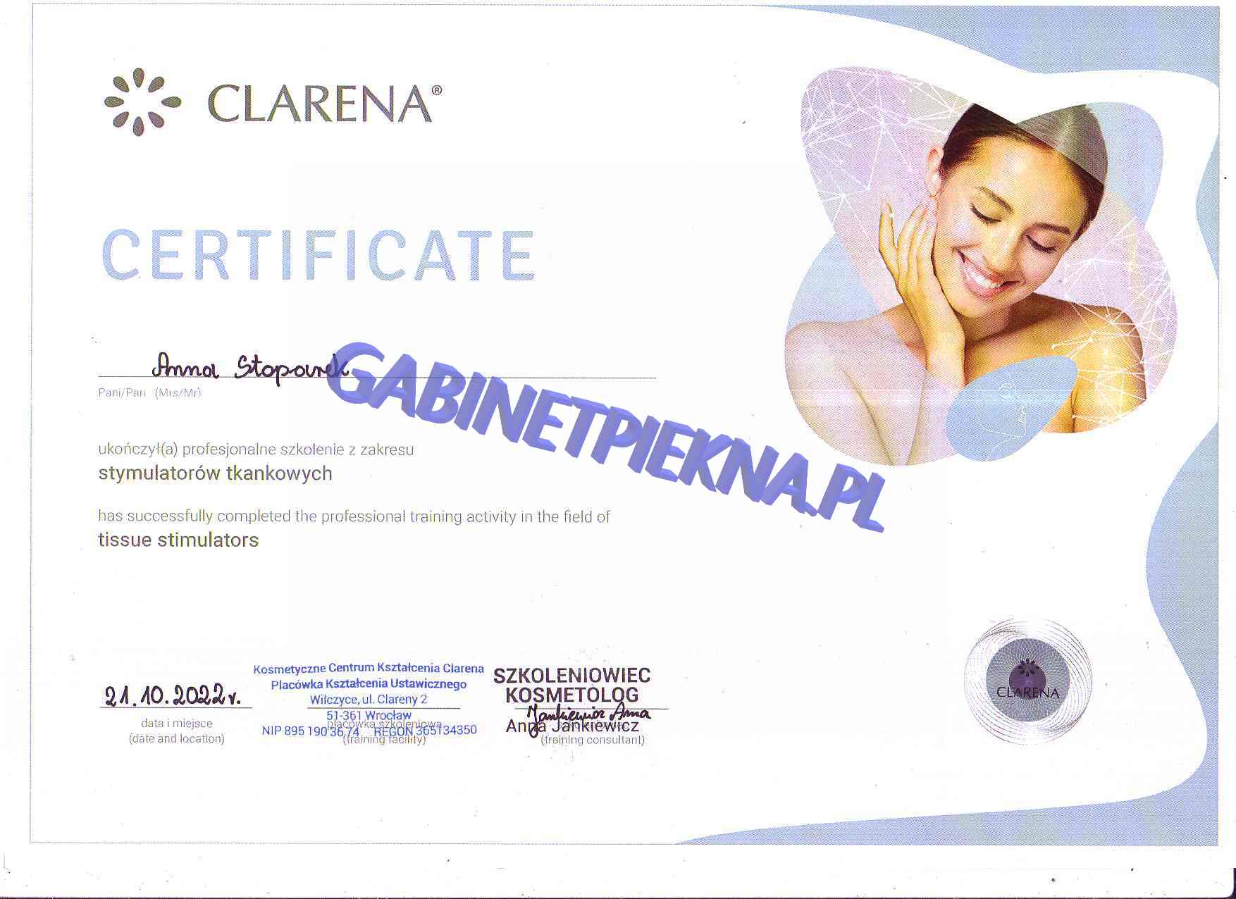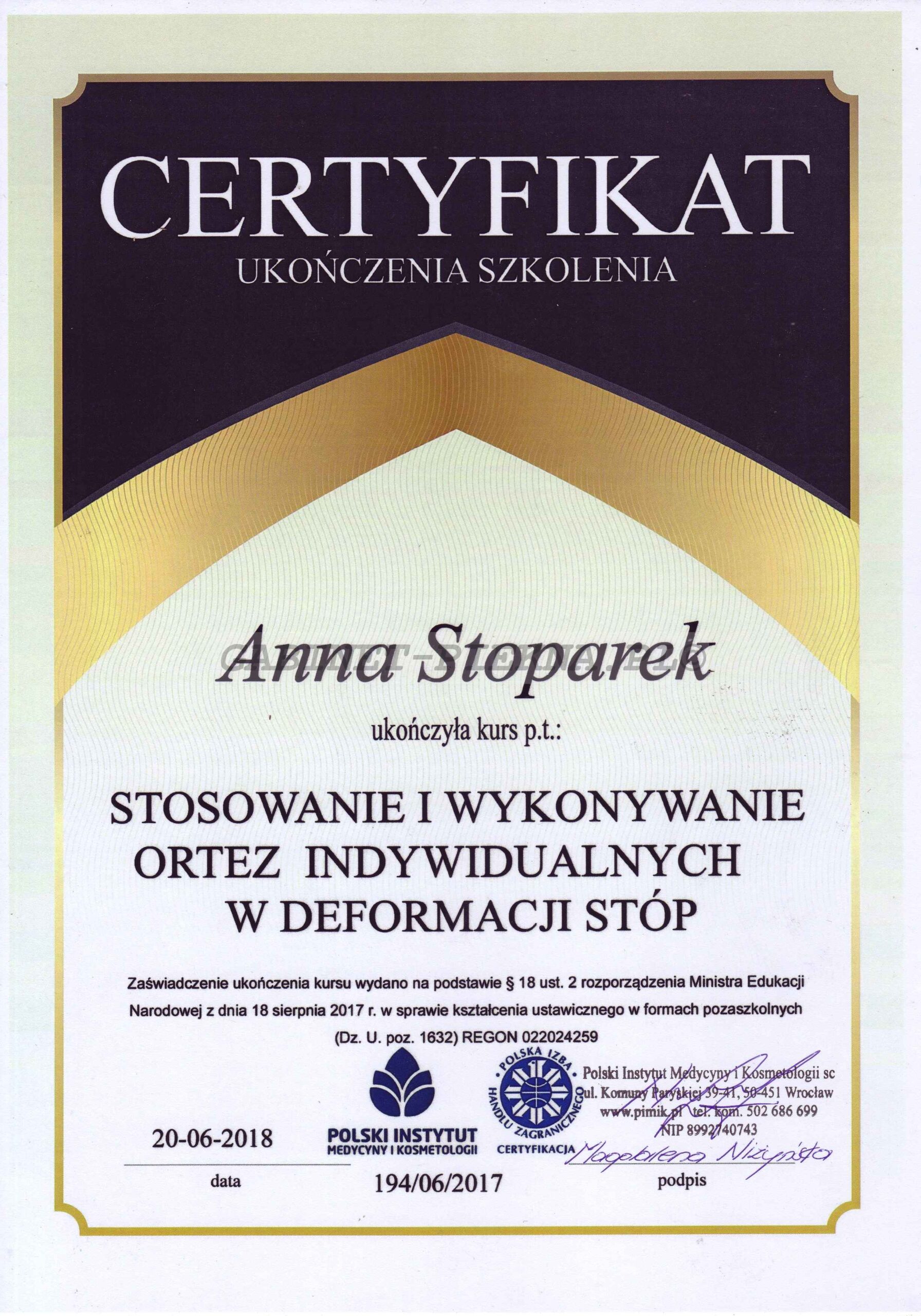 - Ukończona z wyróżnieniem I i II stopnia Państwowa Wyższa Uczelnia AWF we Wrocławiu na wydziale Fizjoterapii, kierunek Kosmetologia/Podologia