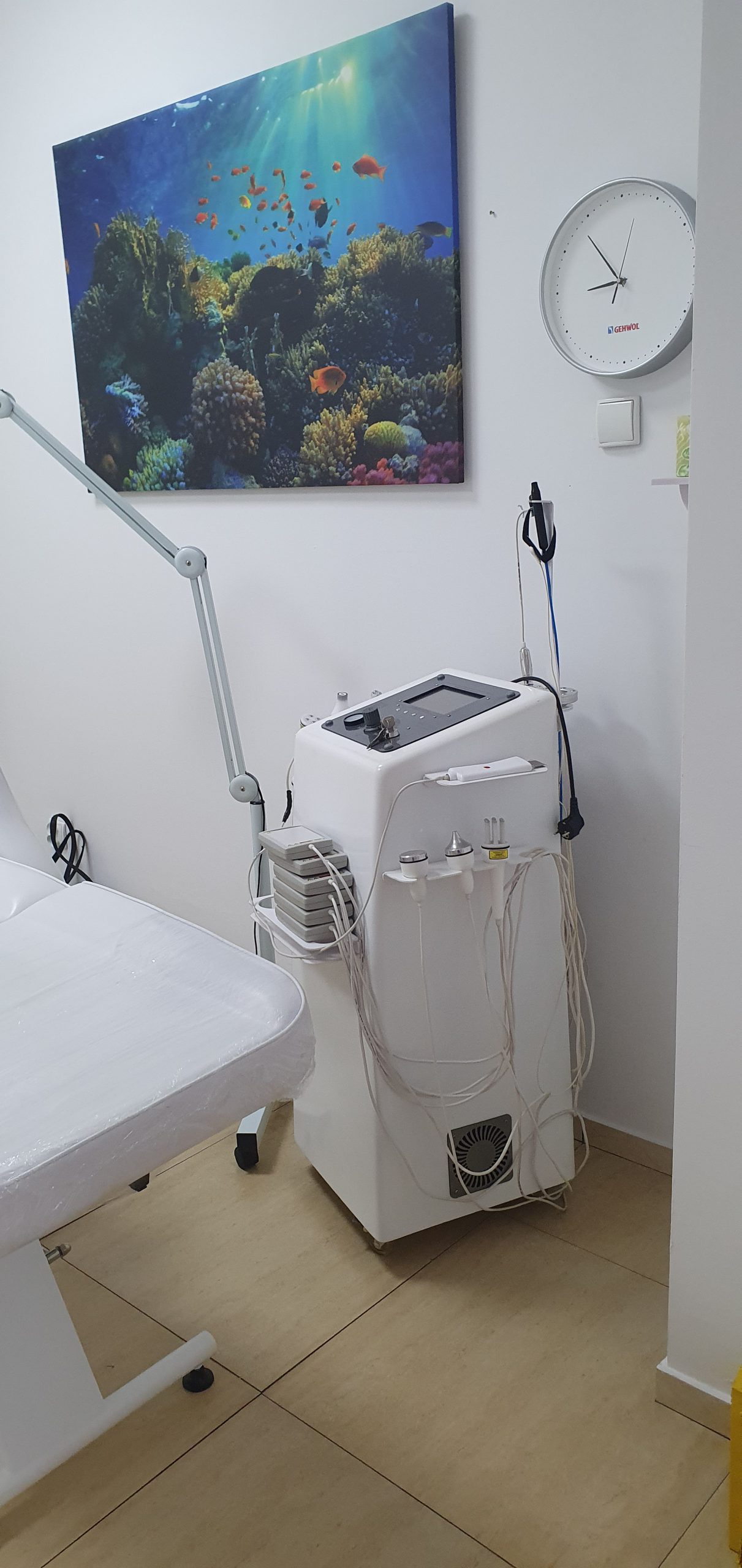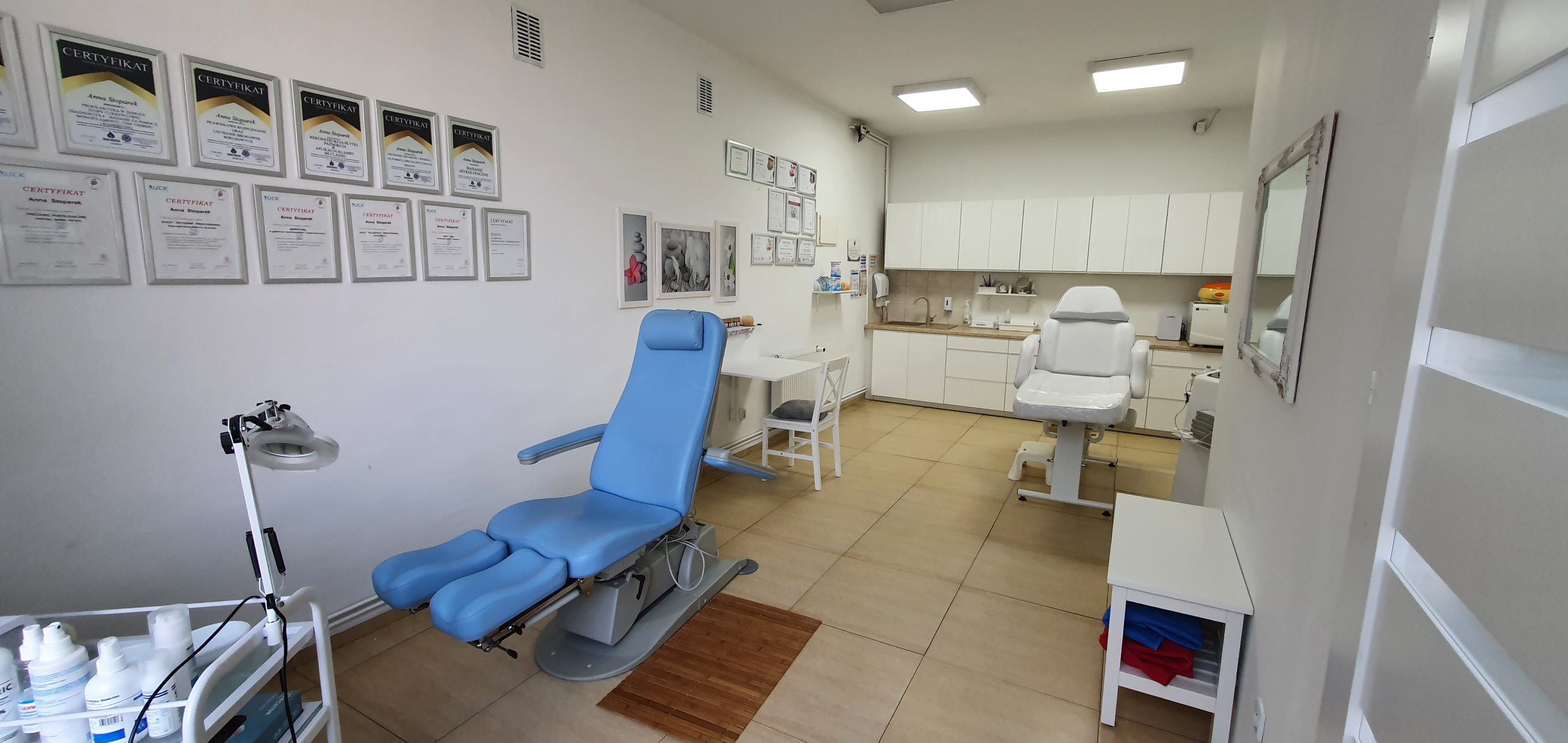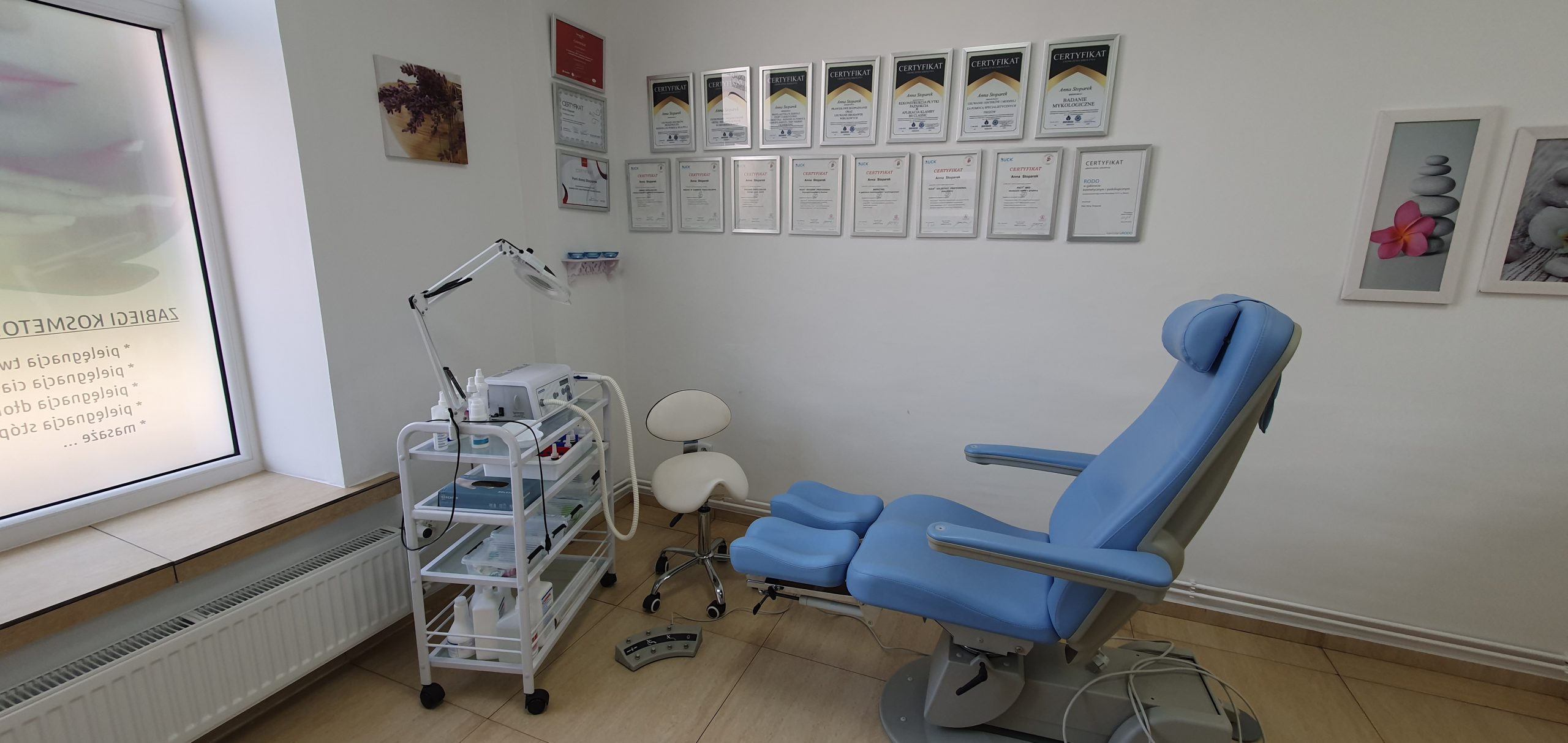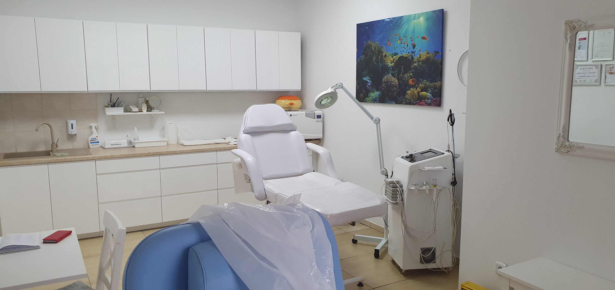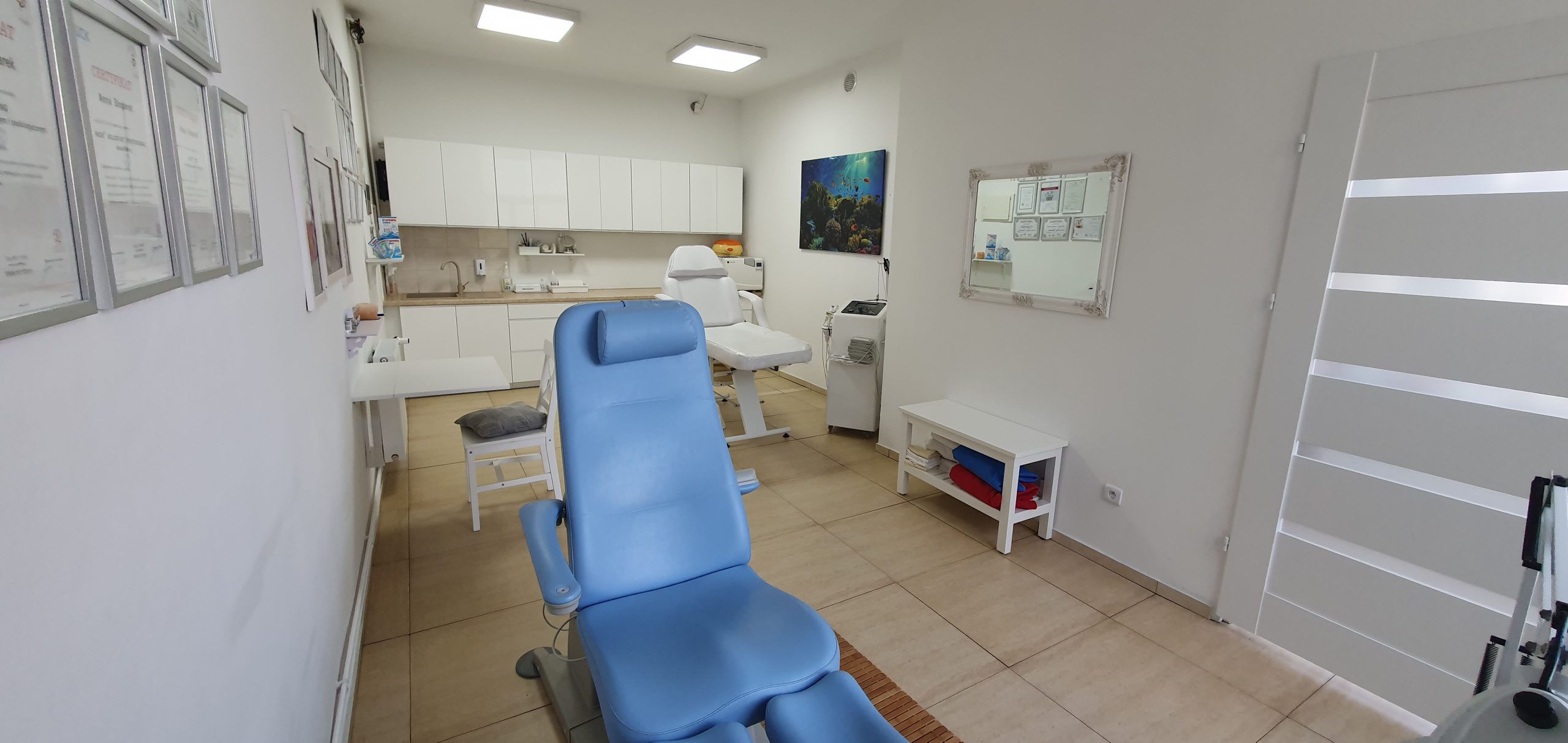 Dodatkowo pomieszczenie zabiegowe sterylizowane jest przy pomocy lampy bakteriobójczej UV